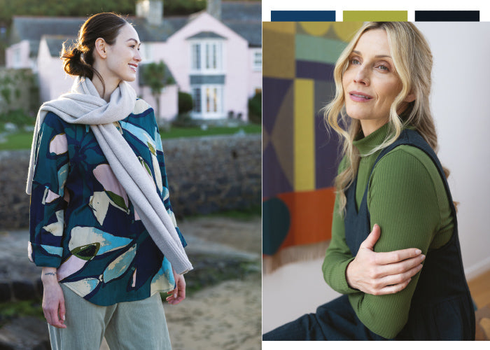 Next is the cosy and understated story, Nordic winter. The earthy tones such as Juniper and Basil, and the icy Nordic hues of the collection reflect the rich colours that are synonymous with Scandinavian nature. Our beautiful and impactful Studio print is the hero of this story, printed onto our Textured Tencel and featuring in a new updated version of our best-selling Bubble Hem Midi Dress.