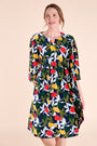 Another casual dress in this exclusive and bold pear print is this beautiful 3/4 sleeve tunic dress. Made of 100% Lenzing Ecovero this dress has a notch neck and pockets on the side.