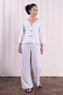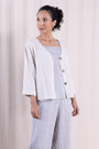 This stylish piece features 3/4 sleeves, a flattering v-neck, and a classic button front closure. Pair it with the matching trousers for a sophisticated and coordinated look, or dress it up with a pair of jeans for a more casual yet chic ensemble. Made from a comfortable and breathable linen blend fabric, this jacket top is perfect for any occasion. Add this piece to your collection for effortless style and endless outfit possibilities.