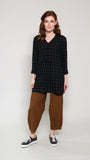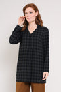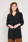 A modern seersucker check combined with three quarter sleeves and a subtle open collar V neck to create a stylish and comfortable tunic that looks great paired with our bamboo tights or organic cotton leggings.